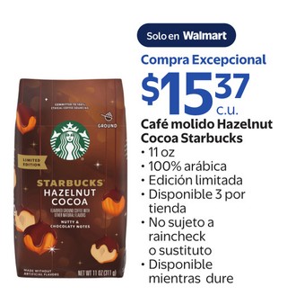 Café molido Hazelnut Cocoa Starbucks 11 oz. 110% arabica Edición limitada.