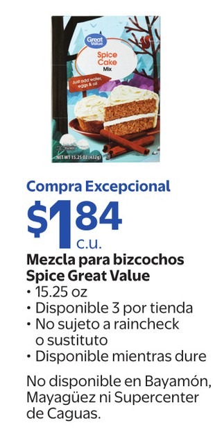 Mezcla para bizcochos Spice Great Value 15.25 oz Disponible 3 por tienda.
