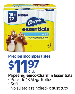 Papel higiénico Charmin Essentials Pqte. de 18 mega Rollos Soft