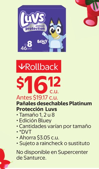 Pañales desechables Platinum Protección Luvs Tamaño 1, 2 u 8 Edición Bluey Cantidades varÃan por tamaños