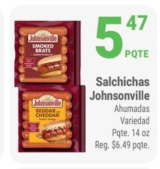 johnsonville smoked brats pqte salchichas ahumadas beddar cheddar variedad pqte. reg. $pqte.