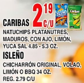 caribas isleno carbas natuchips platanutres maduros, ajo, limón, yuca isleño chicharrón original, volao, limón reg.