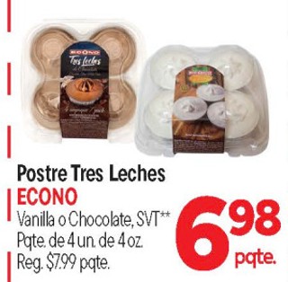 Postre Tres Leches ECONO Vanilla o Chocolate, SVT** Pqte, de 4 un de 4 oz.