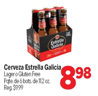 Cerveza estrella Galicia lager o gluten free pqte. de 6 bots. de 11.2 oz.