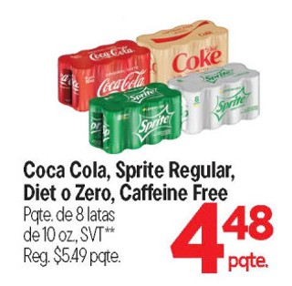 Coca cola, sprite regular, diet o zero, caffeine free pqte. de 8 latas de 10 oz, SVT*