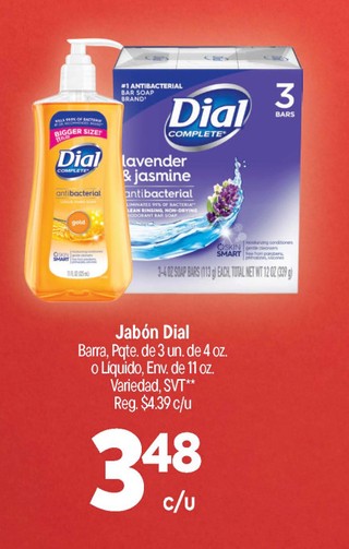 Jabón Dial Barra, Pqte. de 3 un. de 4oz o Liquido, Env. de 110z Variedad, SVT**