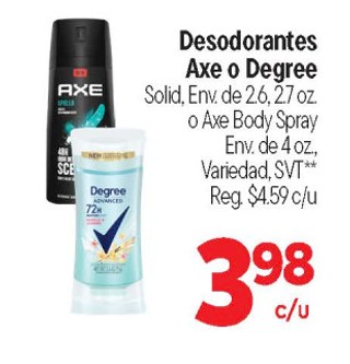 Desodorantes Axe o Degree Solid, Env. de 2.6, 2.7 oz. o Axe Body Spray Env. de 4 oz., Variedad, SVT**