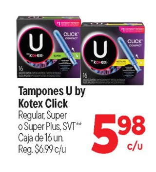 Tampones u by kotex click regular, super o super plus, svt** caja de 16 un.