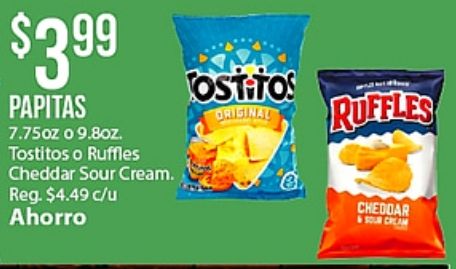 $papitas tostitos ruffles cheddar sour cream. reg. $c/u ahorro original cream