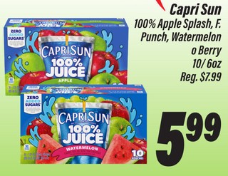 Capri sun 100% apple splash, f. punch, watermelon o berry 10/6oz