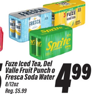Fuze Iced Tea, Del Valle Fruit Punch o Fresca Soda Water 8/12oz