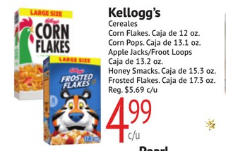 Kellogg's Cereales Corn Flakes. Caja de 12 oz. Corn Pops. Caja de 13.1 oz. Apple Jacks/Froot Loops Caja de 13.2 oz. Honey Smacks. Caja de 15.3 oz. Frosted Flakes.