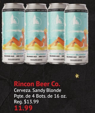 Rincon Beer Co. Cerveza. Sandy Blonde Pqte. de 4 bots. de 16oz