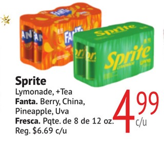 Sprite Lymonade, +Tea Fanta. Berry, China, Pineapple, Uva Fresca. Pqte. de 8 de 12 oz.
