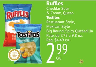 Ruffles Cheddar Sour & Cream, Queso Tostitos Restuarant Style, Mexican Style Big Round, Spicy Quesadilla Pate. de 7.75 a 9.8 oz.