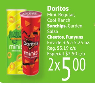 Doritos Mini. Regular, Cool Ranch Sunchips. Garden Salsa Cheetos, Funyuns Env. de 3.6 a 5.25 oz.