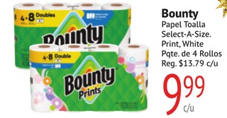 Bounty Papel Toalla Select-A-Size Print, White Pqte. De 4 Rollos