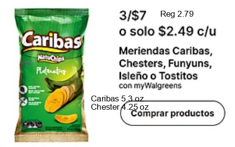 caribas natuchips plateatr /$reg $c/u meriendas chesters, funyuns, isleƱo tostitos mywalgreens chester comprar productos