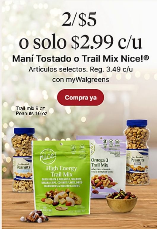 $c/u maní tostado trail nice!ⓡ artículos selectos reg. mywalgreens peanuts compra nice! high energy dred papata pineapple walnuts banana chips, cocent flakes, cranberries&roasted cashews omega aberies almak