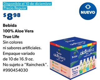 Bebida 100% Aloe Vera True Life Sin colores ni sabores artificiales. Empaque variado de 10 de 16.9 oz. No sujeto a "Raincheck". #990454030