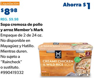 Sopa cremosa de pollo y arroz Member's Mark Empaque de 2 de 24 oz. No disponible en Mayagüez y Hatillo. Mientras duren. No sujeto a "Raincheck" o sustituto. #990419332.