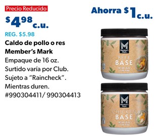 Caldo de pollo res member´s mark empaque de 16 oz. surtido varia por club. sujeto a ´´raincheck´´. mientras duren. #990304411/990304413