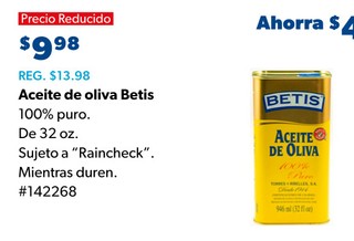 Aceite de oliva betis 100% puro. de 32 oz. sujeto a ´´raincheck´´. mientras duren. #142268
