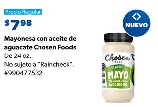Mayonesa con aceite de aguacate chosen foods de 24 oz. no sujeto a ´´raincheck´´. #990477532
