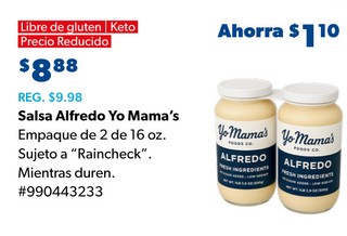Salsa alfredo yo mama´s empaque de 2 de 16 oz. sujeto a ´´raincheck´´. mientras duren. #990443233
