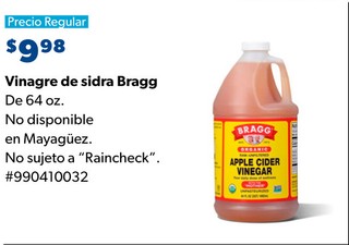 Vinagre de sidra Bragg De 64 oz. No disponible en Mayagüez. No sujeto a "Raincheck". #990410032
