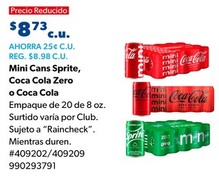 Mini Cans Sprite, Coca Cola Zero o Coca Cola Empaque de 20 de 8 oz. Surtido varÃa por Club. Sujeto a "Raincheck". Mientras duren. #409202/409209 990293791