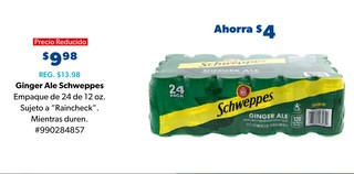 Ginger Ale Schweppes Empaque de 24 de 12 oz. Sujeto a "Raincheck". Mientras duren. #990284857