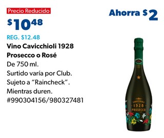 Vino Cavicchioli 1928 Prosecco o Rosé De 750 ml. Surtido varÃa por Club. Sujeto a "Raincheck". Mientras duren. #990304156/980327481