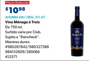 Vino Ménage à Trois De 750 ml. Surtido varÃa por Club. Sujeto a "Raincheck". Mientras duren. #980287842/980327388 984152609/280066 412571