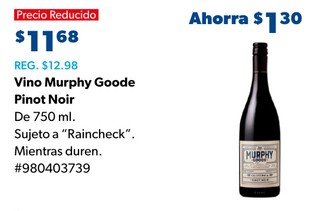 Vino Murphy Goode Pinot Noir De 750 ml. Sujeto a "Raincheck". Mientras duren. #980403739