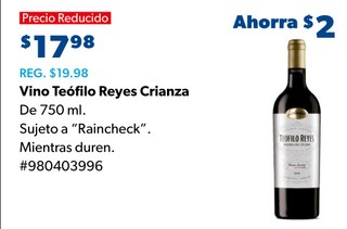 Vino Teófilo Reyes Crianza De 750 ml. Sujeto a "Raincheck". Mientras duren. #980403996