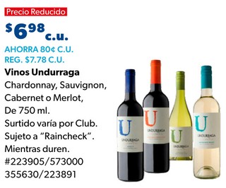 Vinos Undurraga Chardonnay, Sauvignon, Cabernet o Merlot, De 750 ml. Surtido varÃa por Club. Sujeto a "Raincheck". Mientras duren. #223905/573000 355630/223891