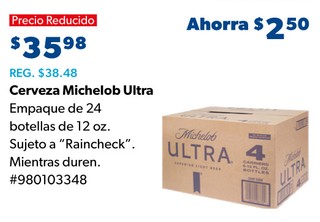 Cerveza Michelob Ultra Empaque de 24 botellas de 12 oz. Sujeto a "Raincheck". Mientras duren. #980103348 .