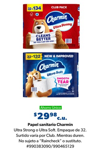 Papel sanitario Charmin Ultra Strong o Ultra Soft. Empaque de 32. Surtido varÃa por Club. Mientras duren. No sujeto a "Raincheck" o sustituto. #990383090/990465129