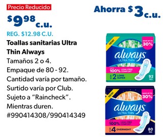 Toalla sanitarias Ultra Thin Always Tamaños 2 o 4 Empaque de 80 - 92. Cantidad varia por tamaño.