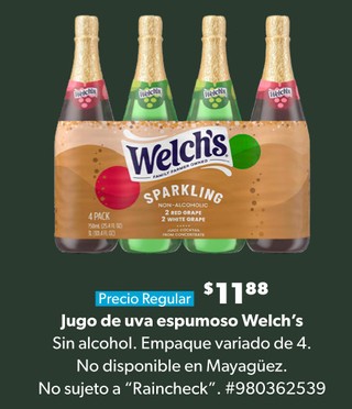 Jugo de uva espumoso Welch's Sin alcohol. Empaque variado de 4. No disponible en Mayagüez. No sujeto a "Raincheck". #980362539