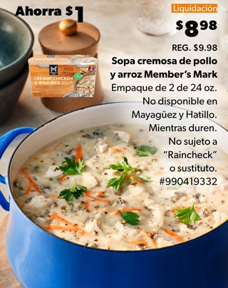 Sopa cremosa de pollo y arroz Member's Mark Empaque de 2 de 24 oz. No disponible en Mayagüez y Hatillo. Mientras duren. No sujeto a "Raincheck" o sustituto. #990419332