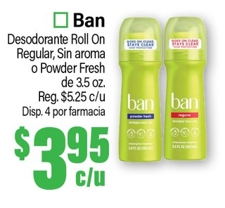 Ban Desodorante Roll On Regular, Sin aroma o Power Fresh de 3.5 oz.