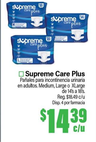 Supreme Care Plus Pañales para incontinencia urinaria en adultos. Medium, Large o XLarge de 14's a 18's.