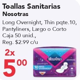 toallas sanitarias long overnight thin pqte pantyliners, corto caja unid., reg. $c/u