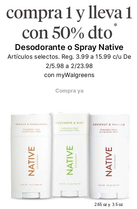 compra desodorante spray native artÃculos selectos reg. /con mywalgreens cucumber mint vanilla sandalwood coconut paraben free aluminum deodorant (they