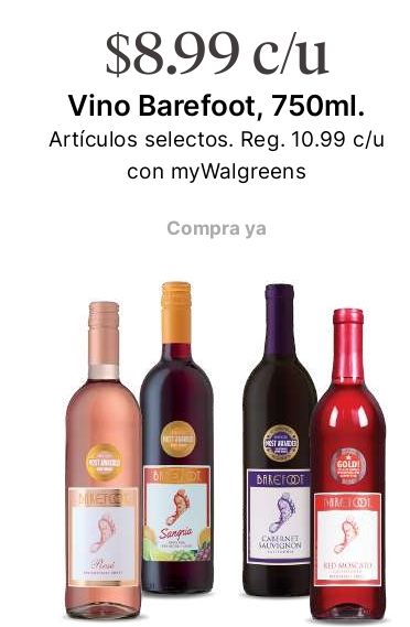 $c/u vino barefoot artÃculos selectos. reg. mywalgreens compra gold! thime loot sangria caminet sauvignon moscato