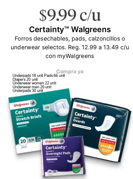 $c/u certainty walgreens forros desechables pads, calzoncillos underwear selectos reg. mywalgreens compra underpads unit pads diapers women unisex stretch briefs dry-lock cort certainty™ men's guards count women's overnight cons aximum