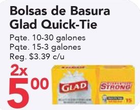 bolsas basura glad quick-tie pqte alones pqte. reg. $c/u strong