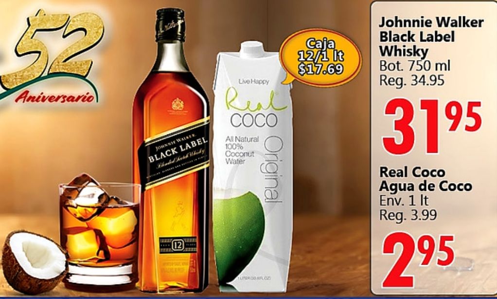 aniversario johnsie walker black label live happy real coco natural coconut water uter flcun original caja $johnnie whisky reg. agua env.